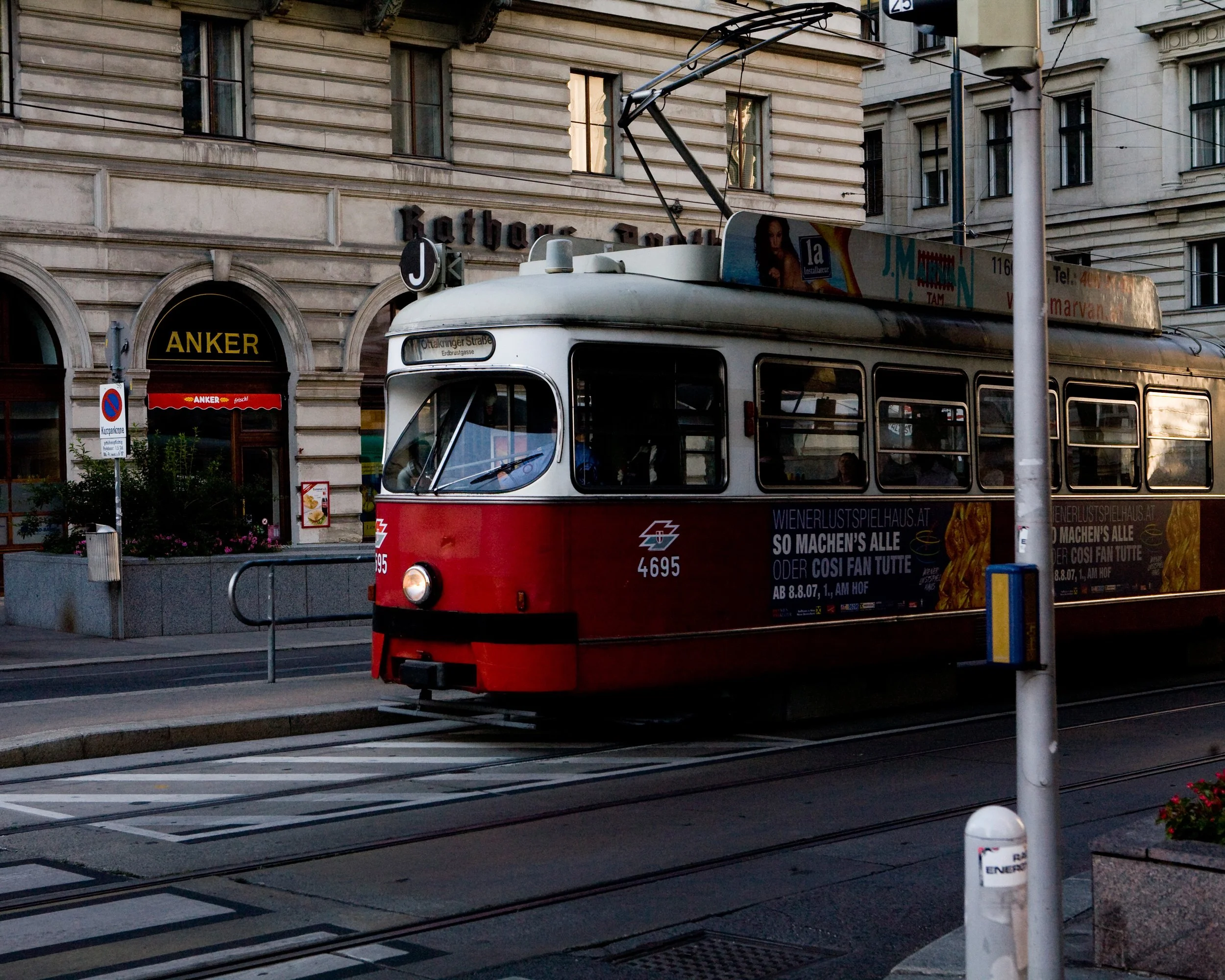 A red and white tram traveling along city tracks with buildings and storefronts in the background, including a sign for 'Anker' store. View fullsize
