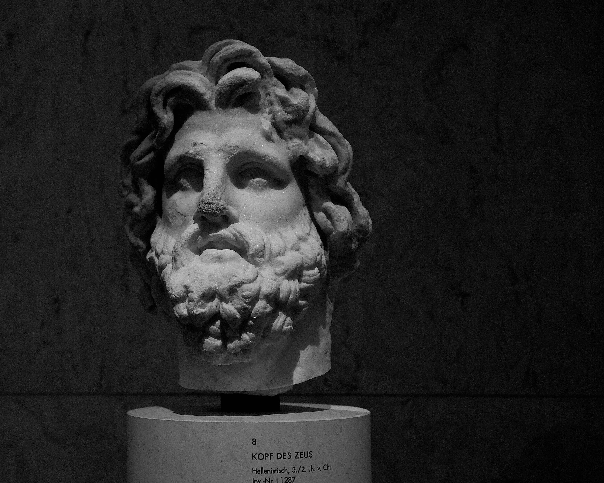 Black and white sculpture of Zeus with a beard and curly hair displayed on a pedestal.