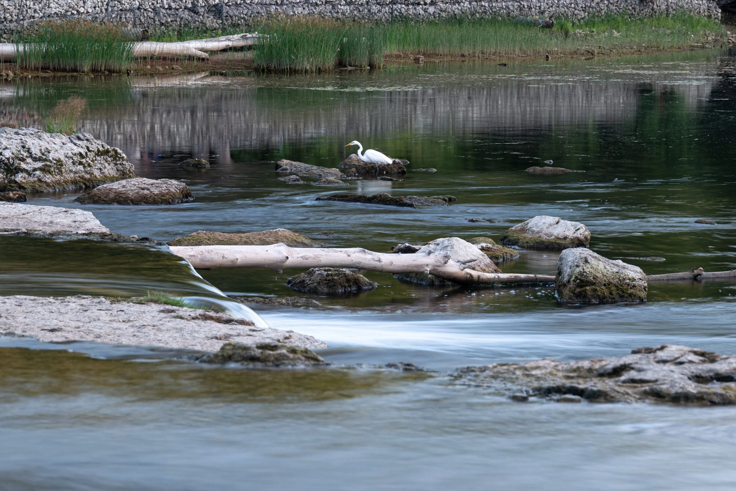 A river with rocks and driftwood, a white heron standing on a rock near the water, green grasses and trees reflected in the water. View fullsize