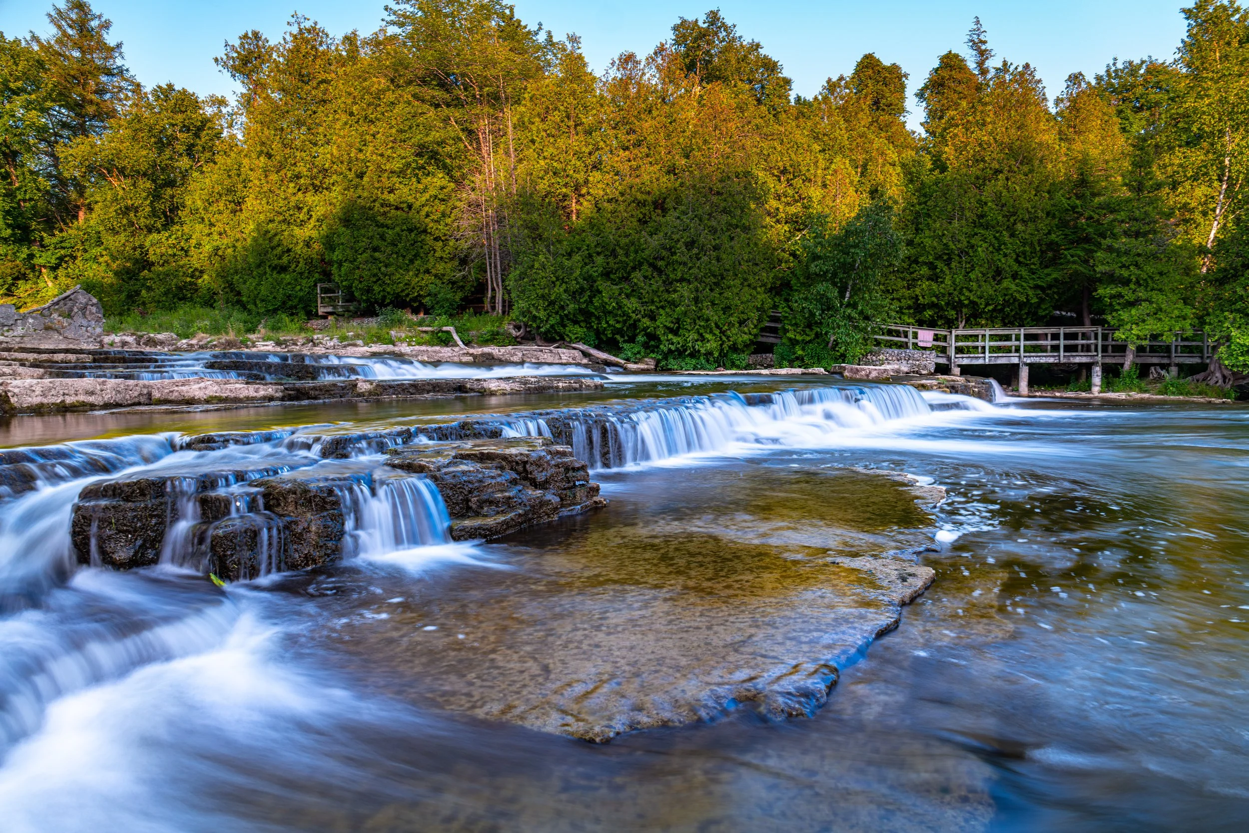 A river flowing over rocks with a small waterfall, surrounded by lush green trees and a bridge in the background.
