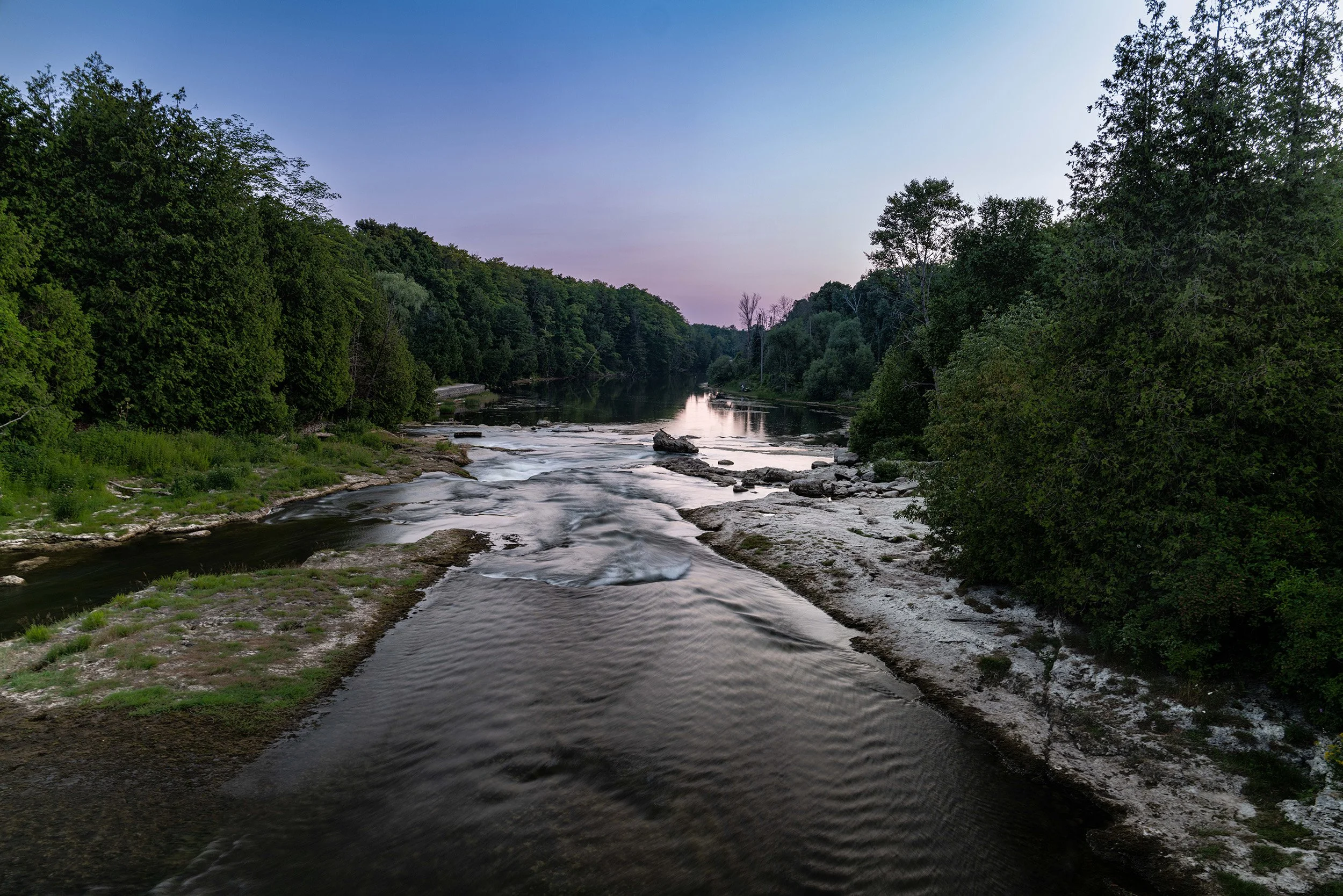 A peaceful river flowing through a forested area at dusk with a clear sky. View fullsize