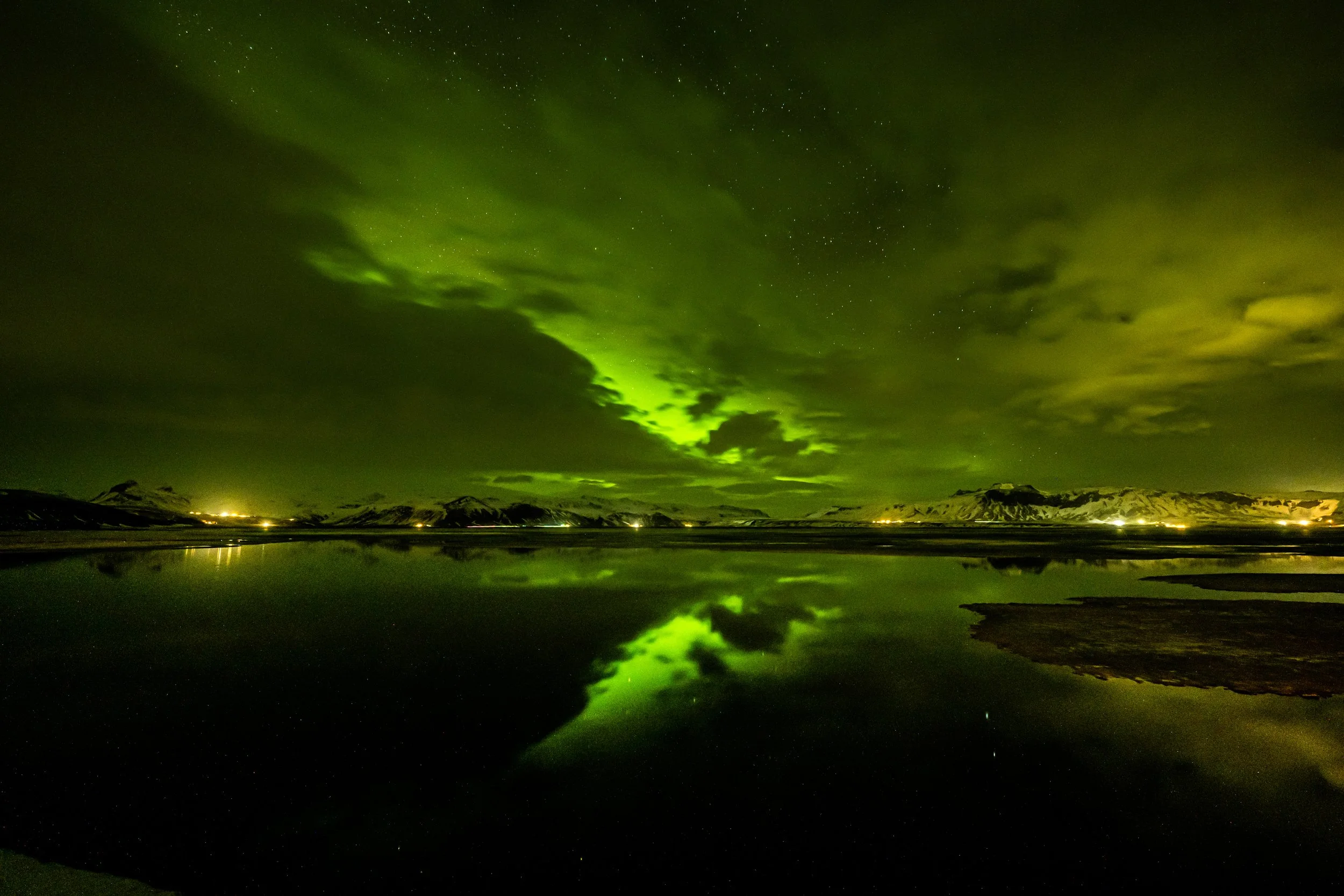 Northern lights glowing green in the cloudy night sky over a still lake with a mountain range in the distance. View fullsize