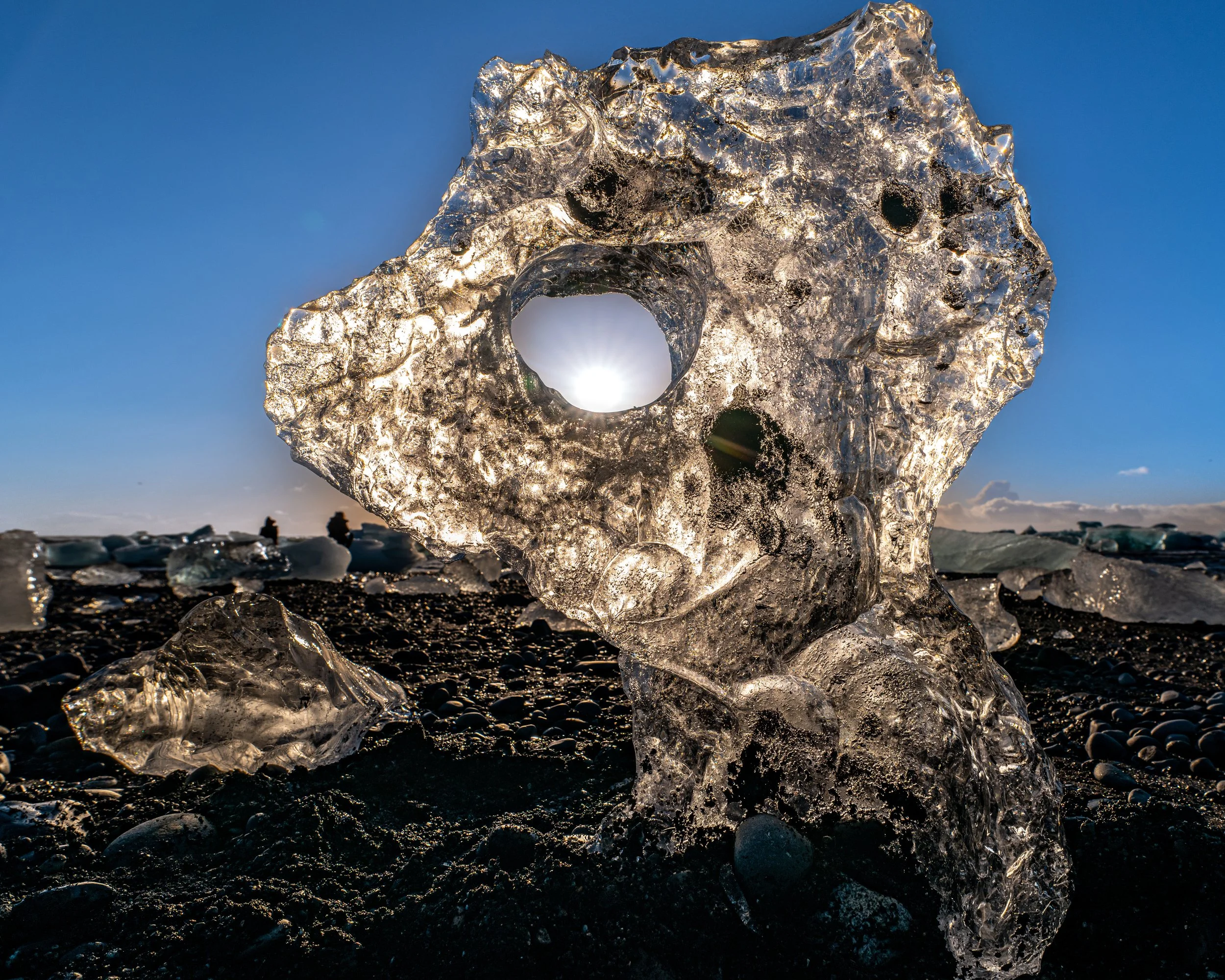 Close-up of a large, transparent ice chunk with the sun shining through a hole in the center, surrounded by smaller ice fragments on a dark pebble beach under a blue sky.