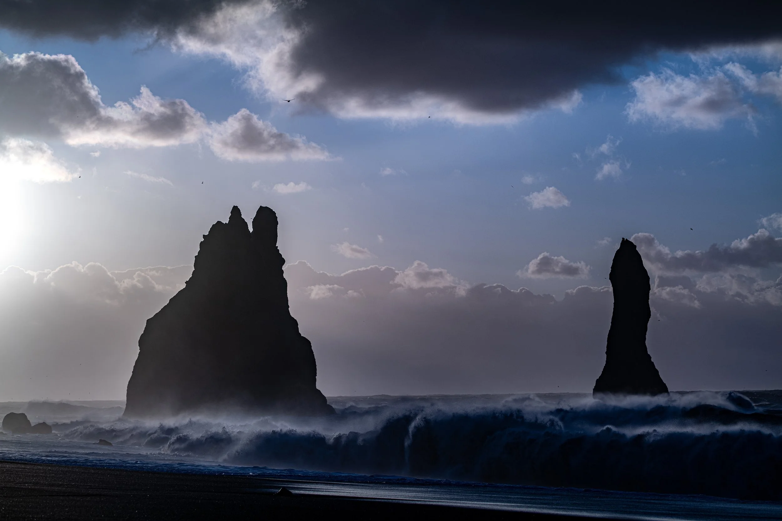 Silhouetted sea stacks along a beach with large waves and a partly cloudy sky.