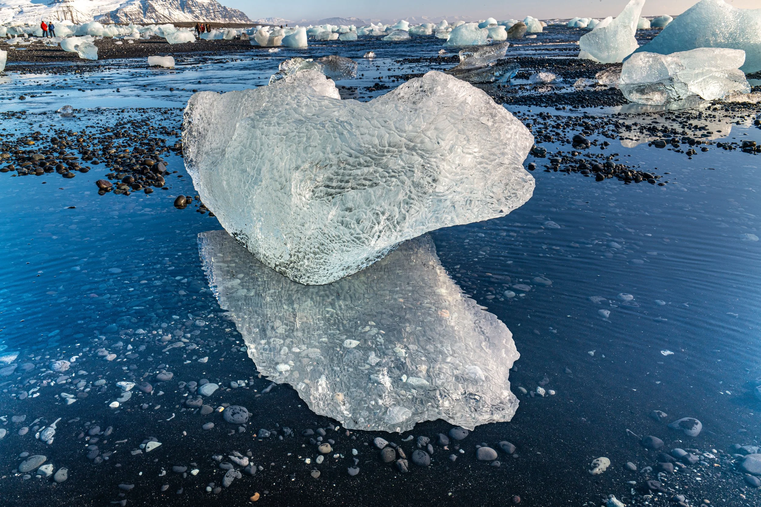 Sunset over a black sand beach with large ice chunks scattered across the shore. View fullsize