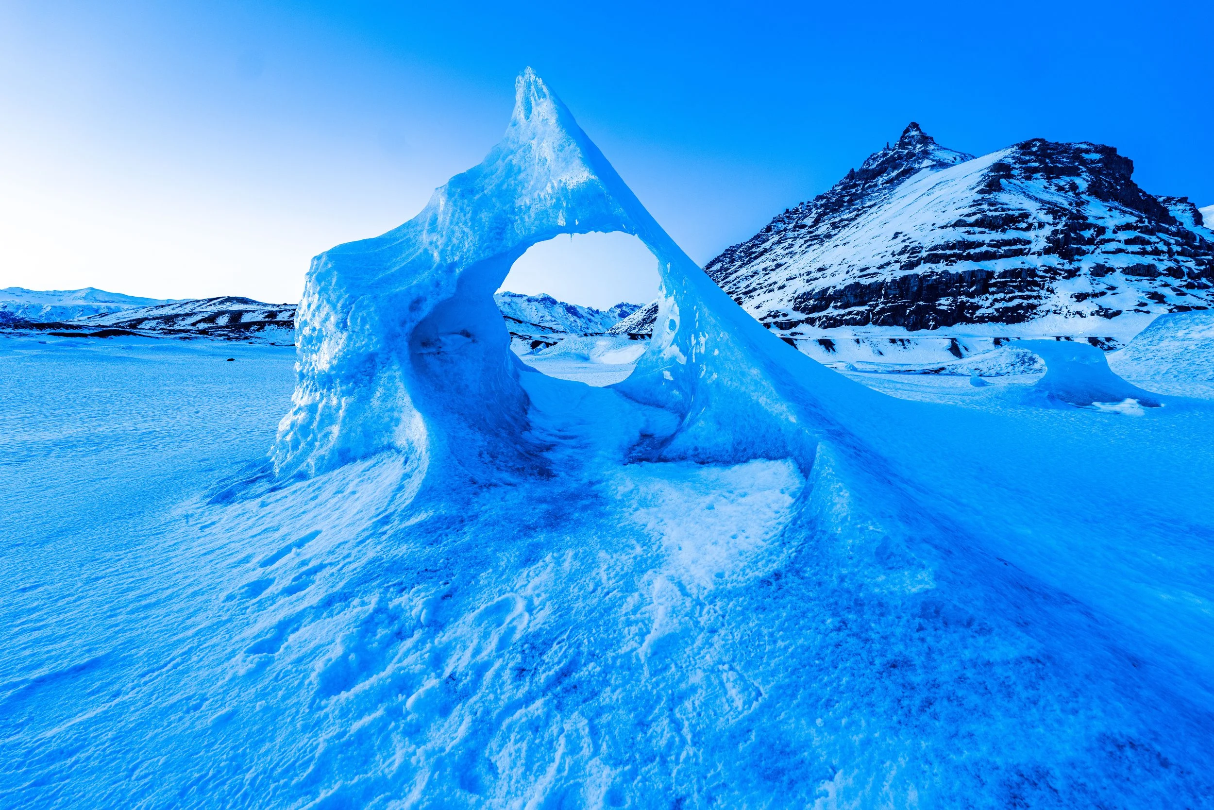 Ice formation resembling an arch in a snowy landscape with mountain backdrop