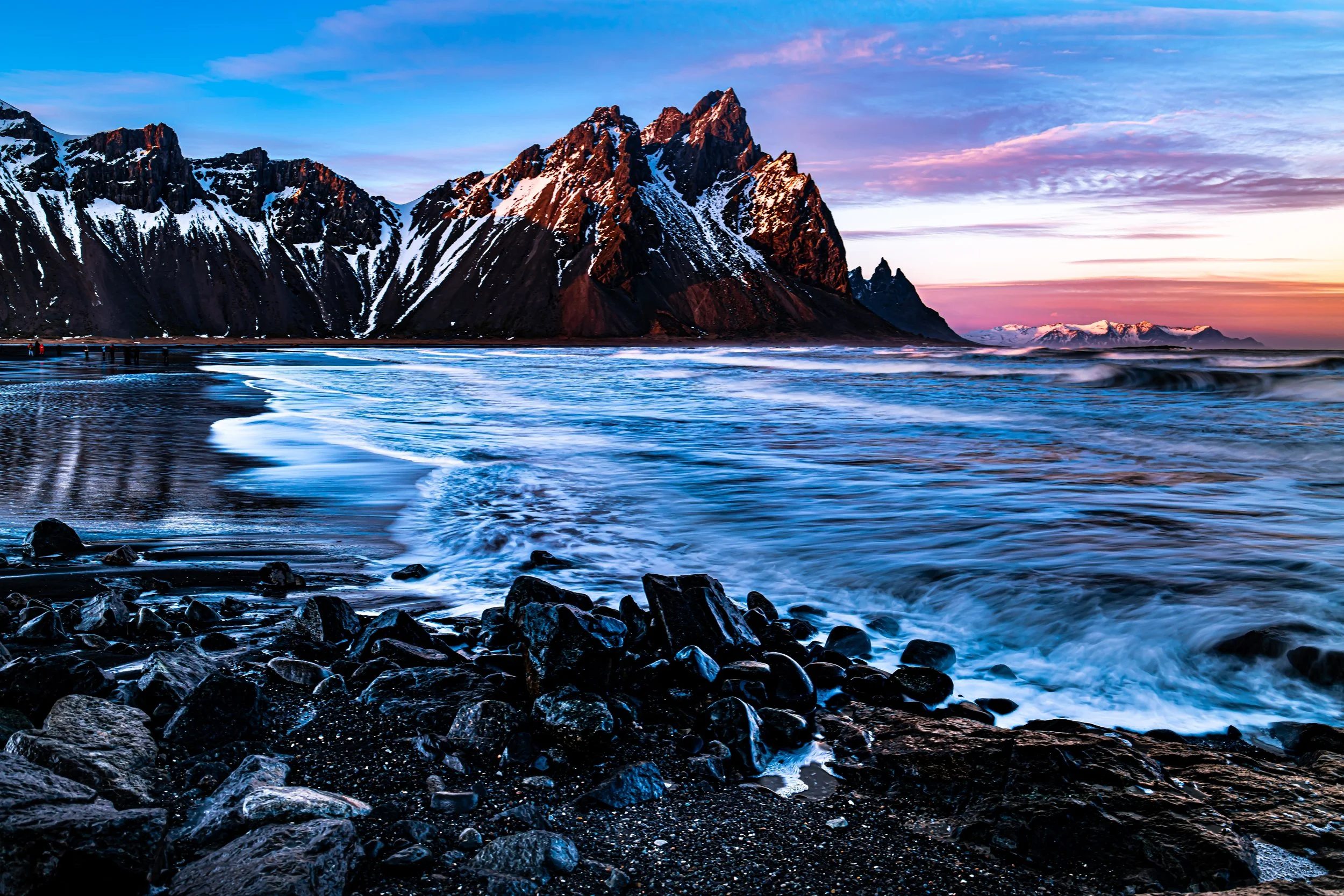 A scenic view of a beach with black volcanic rocks in the foreground, ocean waves crashing, a mountain range with snow on the peaks in the background, and a colorful sky at sunset.