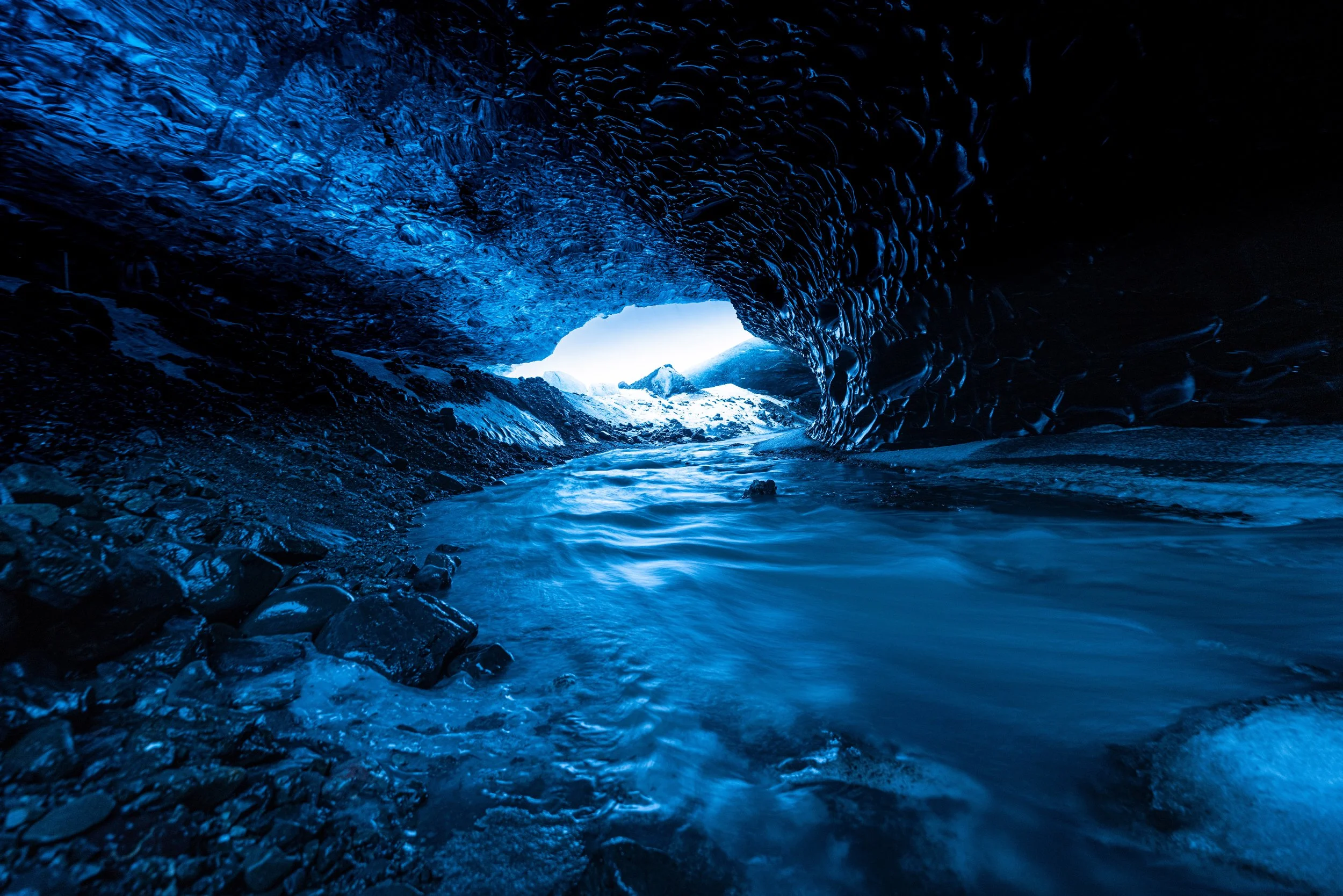 A snowy glacier cave with a flowing stream of water inside, illuminated by natural light from the cave opening View fullsize