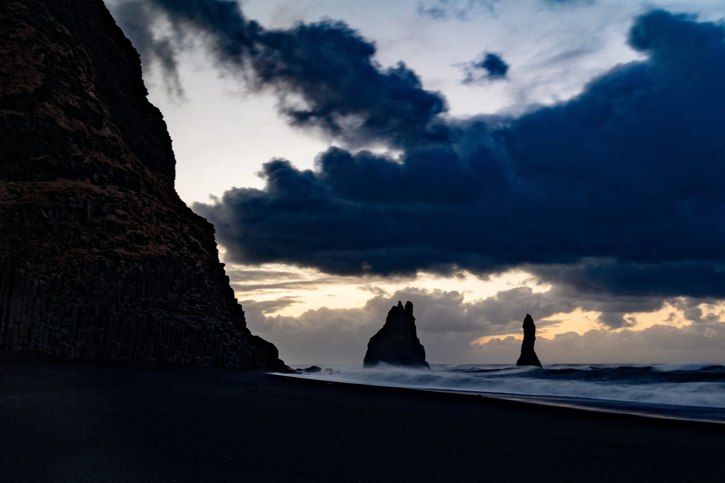 A dark beach scene with large rock formations in the water and heavy clouds in the sky at sunset or sunrise.