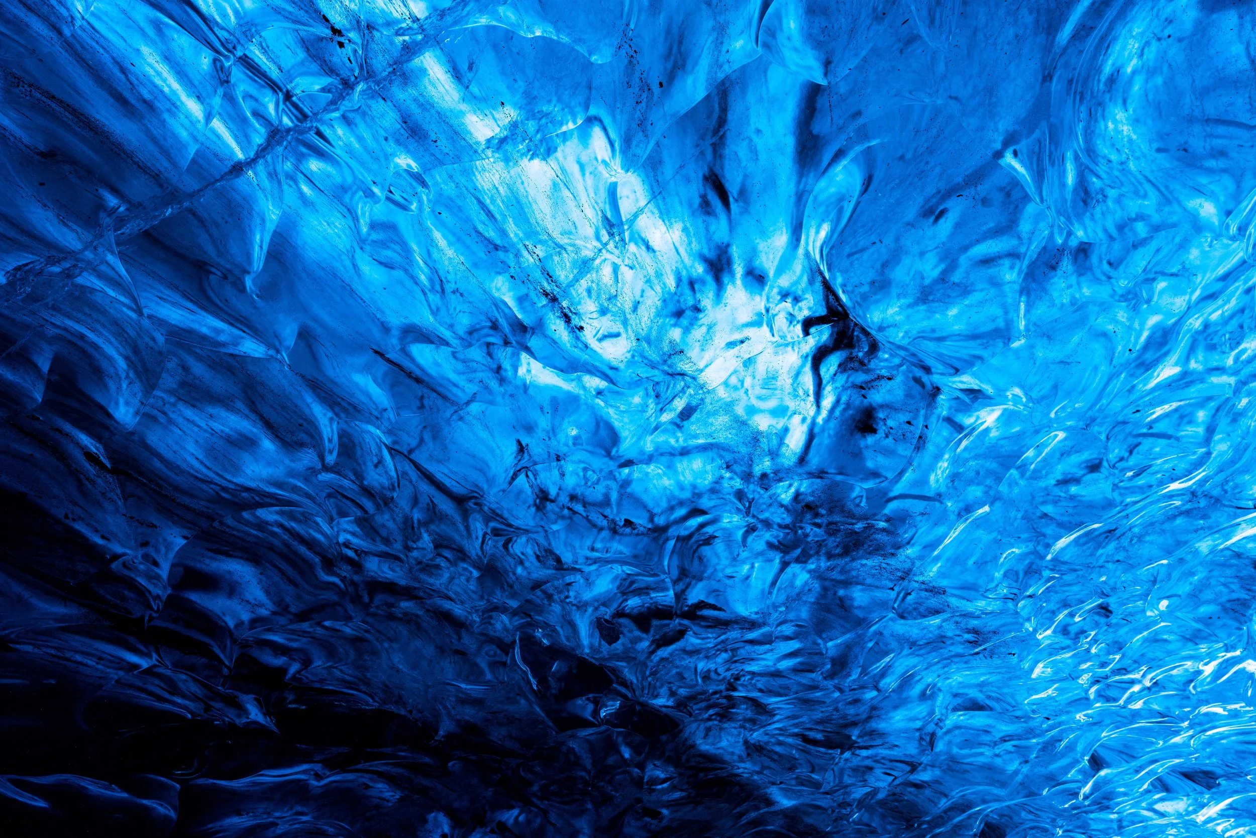 Inside view of a blue ice cave showing icy walls and a snow-covered floor, with an opening to the outside sky.