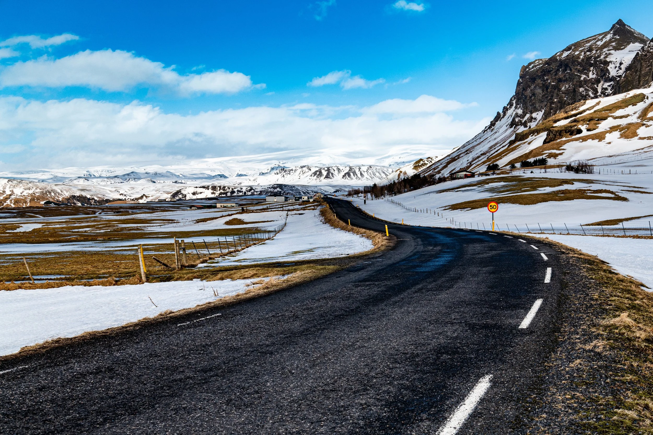 A winding asphalt road through snow-covered fields and hills, with a mountain in the background under a partly cloudy sky.