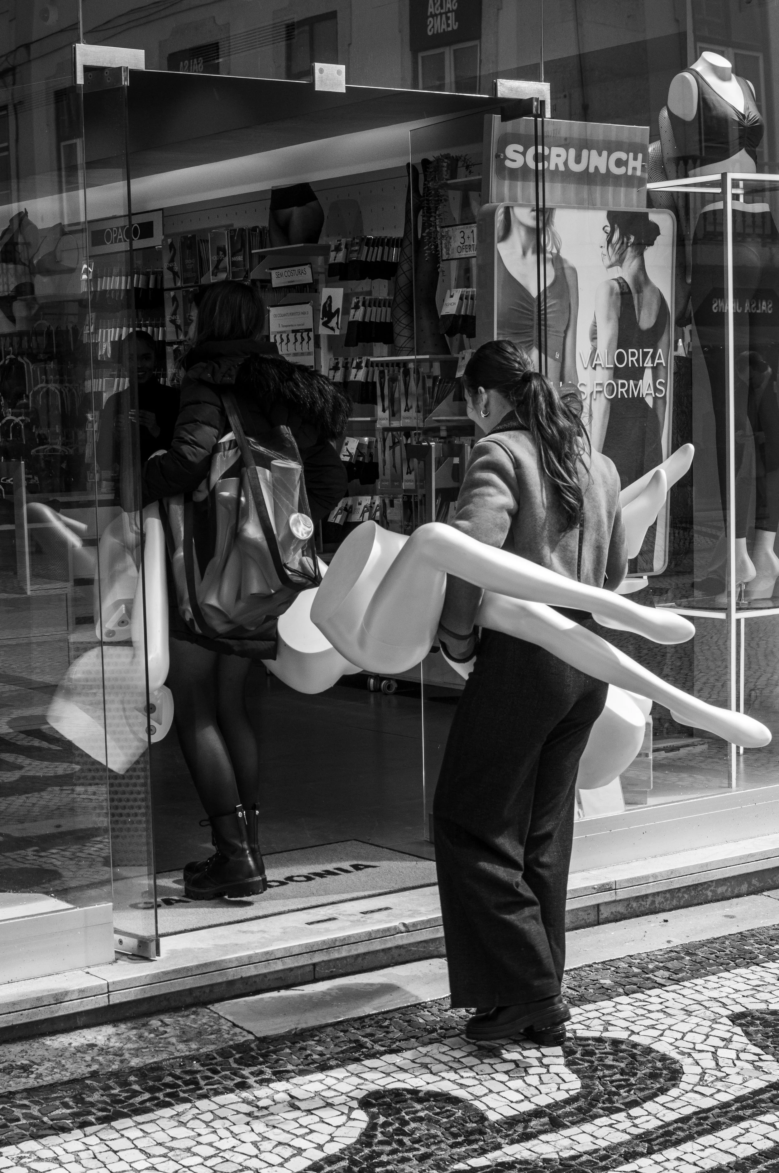 A woman outside a clothing store holding a large inflatable object, with another woman inside looking at items on the shelf. The shop window displays mannequins with athletic clothing, and there are signs and advertisements visible.