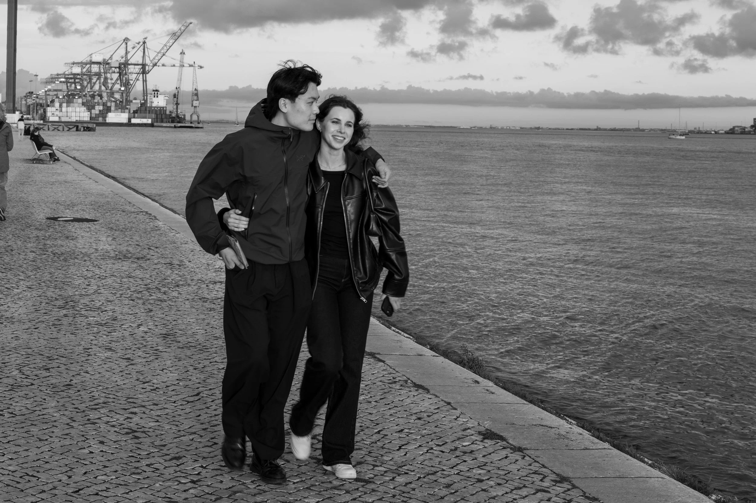 A black and white photo of a young man and woman walking along a waterfront promenade, with industrial cranes and ships in the background.
