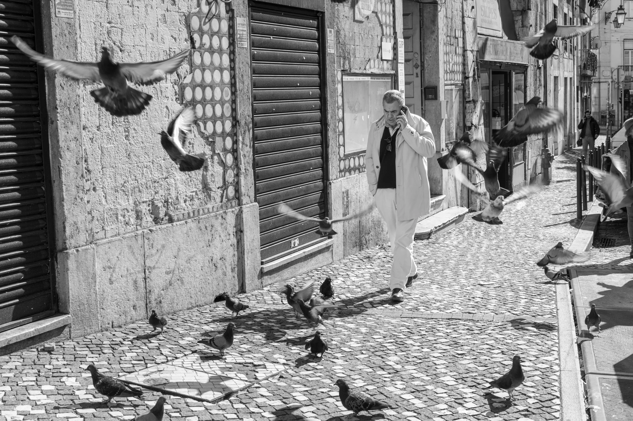 A man in a white coat walking along a cobblestone street talking on his phone, surrounded by pigeons both on the ground and in flight. View fullsize
