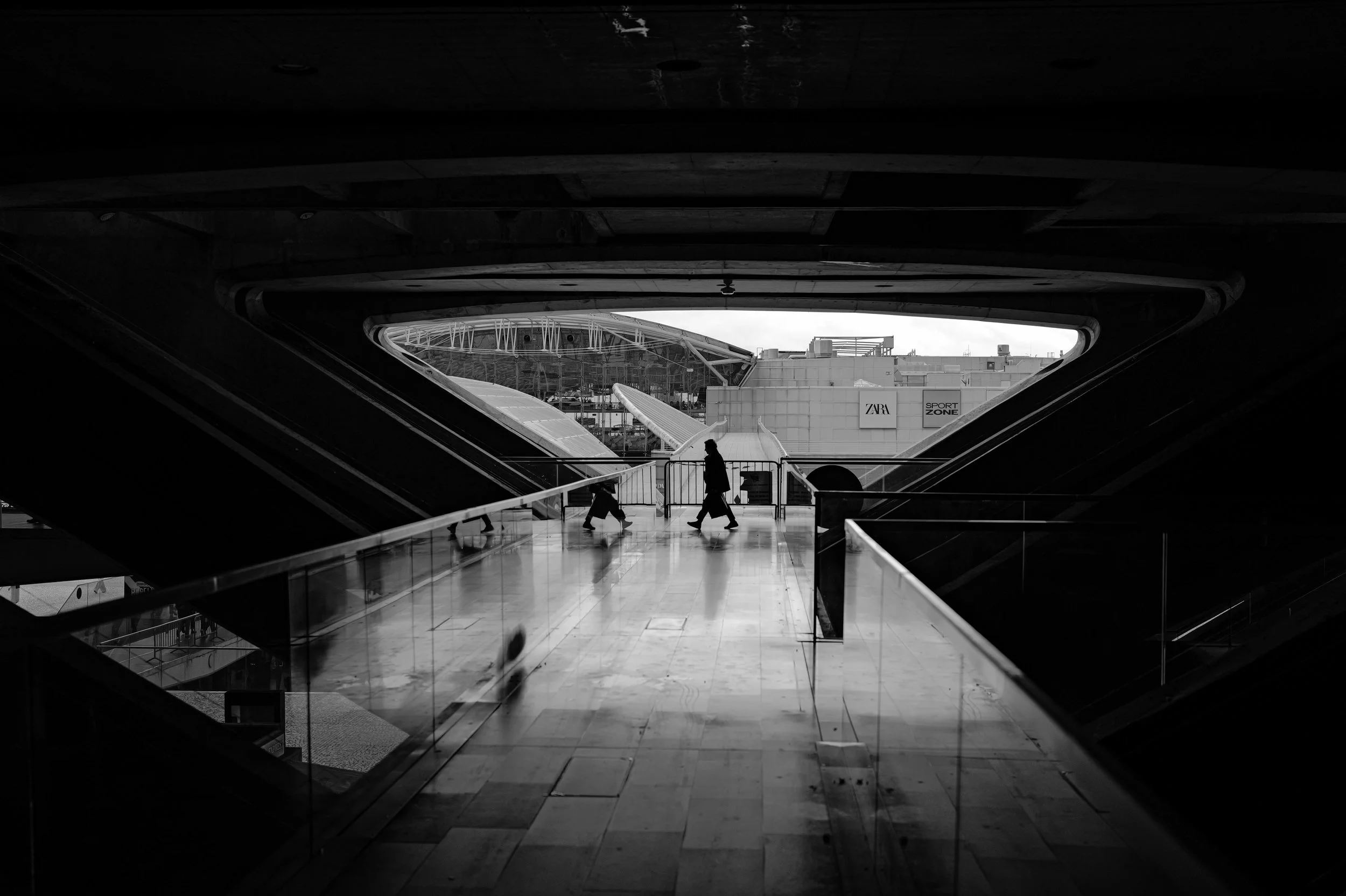 Silhouetted pedestrians walking in a modern, open-air passageway in an urban shopping center with a view of a cityscape and retail stores outside.