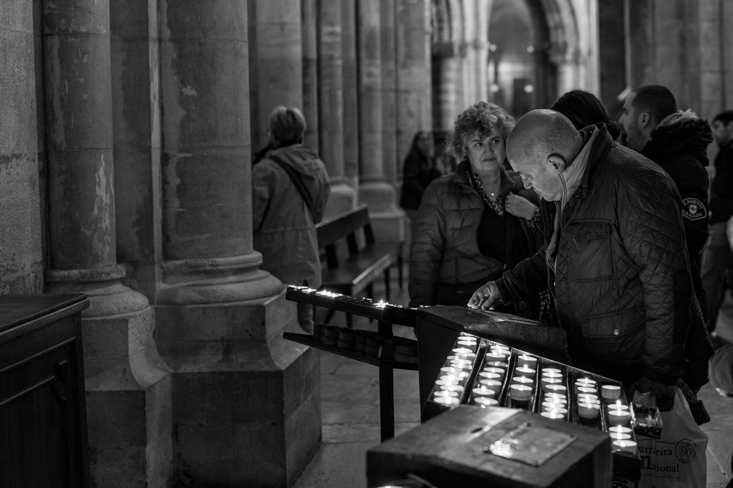 People lighting candles inside a church, some engaged in quiet reflection. View fullsize