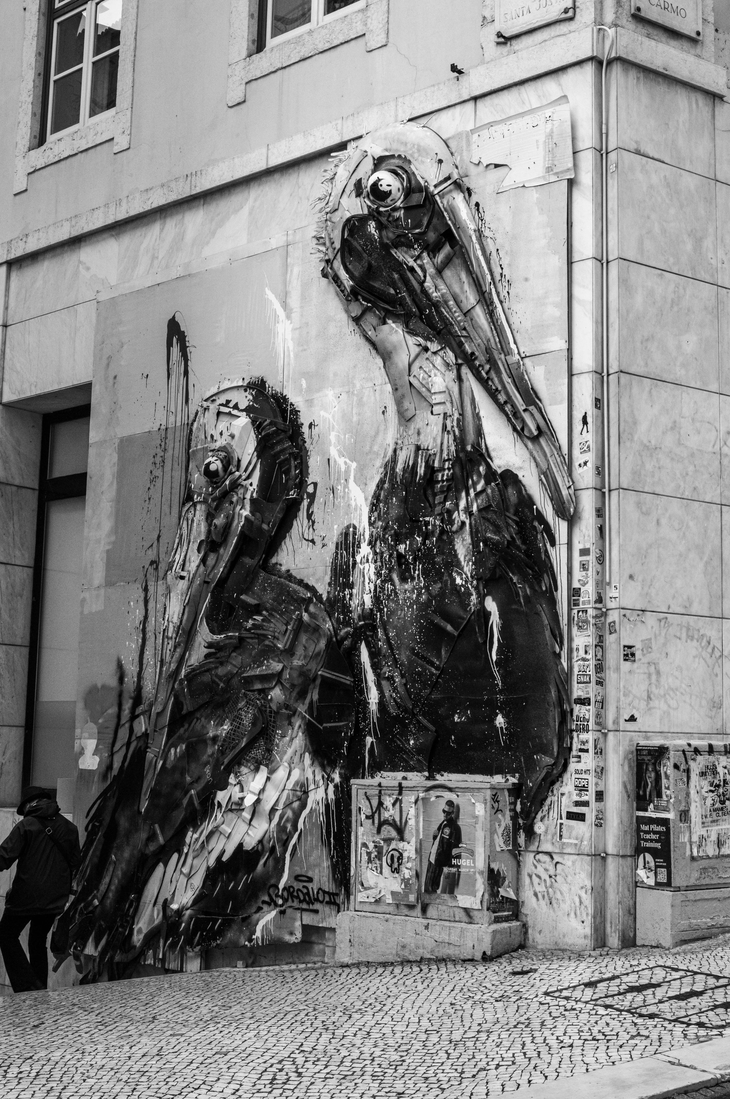 Street art mural in black and white depicting two large, robotic birds with detailed mechanical features on a building wall.