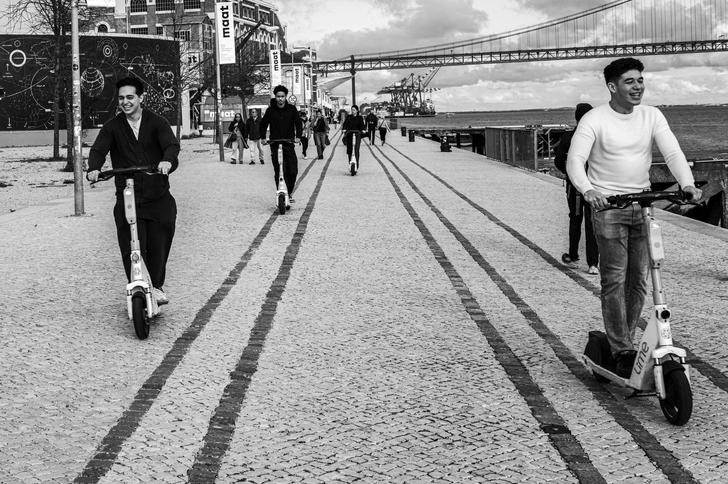 Several people riding electric scooters along a waterfront promenade, with some walking in the background and industrial cranes visible over the water.