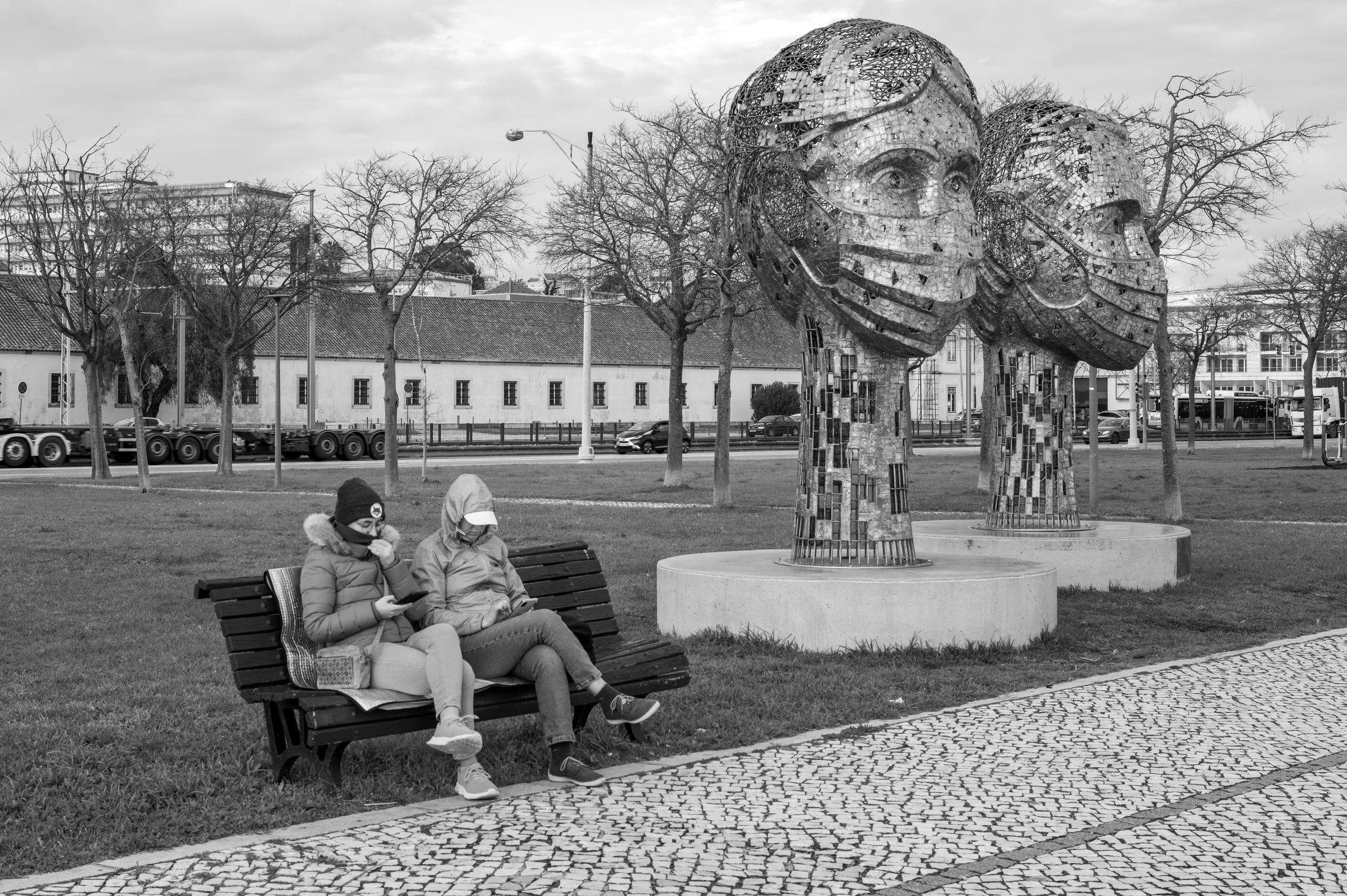 Two children sitting on a park bench looking at their phones, with a large metal sculpture of three overlapping human heads behind them in an outdoor park setting on a cloudy day. View fullsize