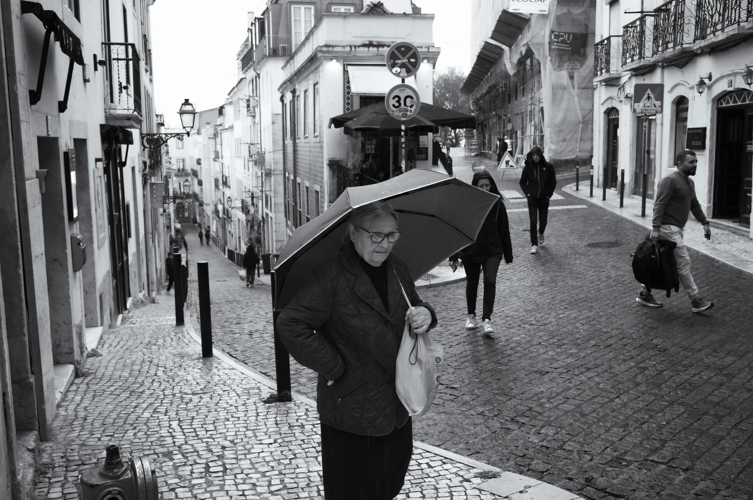 A black and white photo of a city street with cobblestone pavement and old buildings. An older woman with glasses, a quilted jacket, and carrying a shopping bag is under an umbrella. Several pedestrians walk along the street, some with hoodies and ba