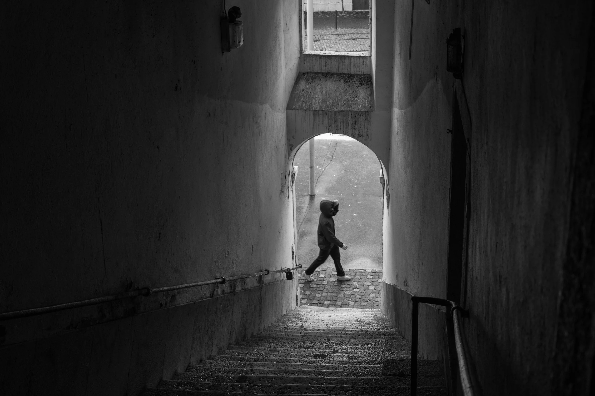 A person walking down an outdoor cobblestone street visible through an arched opening at the bottom of a narrow, dark stairwell.